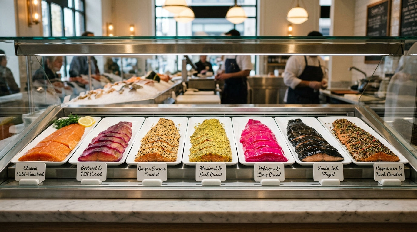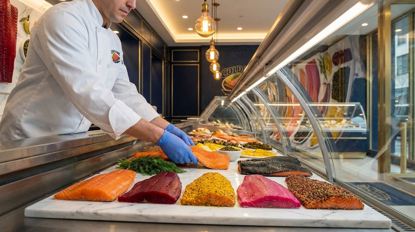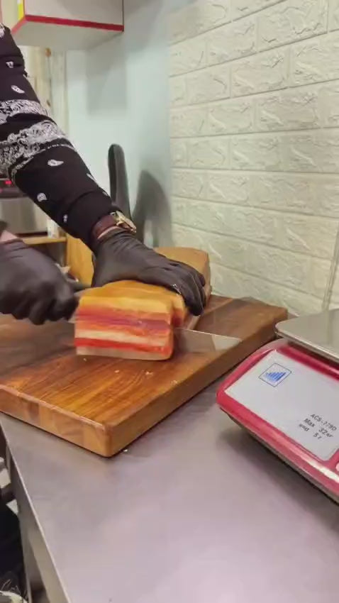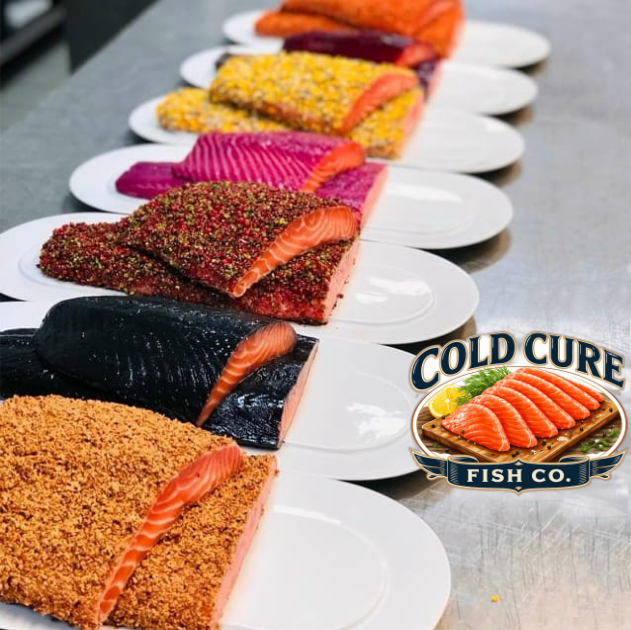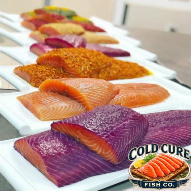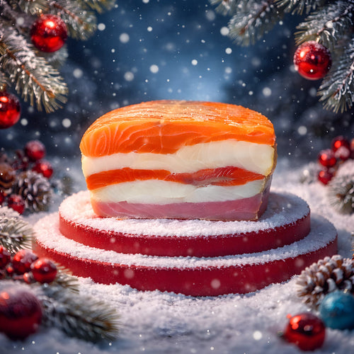 Fish rolls are a type of pressed fish roulette—a large, dense cake made by layering cured and cold-smoked fish fillets and pressing them together into a solid block, often around 6×6 inches. Each layer is a different kind of fish (for example salmon, sturgeon, halibut, or tuna), and the contrast between those layers is what makes them unique. The fish are carefully trimmed, cured with salt and seasonings, and then cold-smoked at low temperatures to preserve their texture and natural flavor without cooking them.
